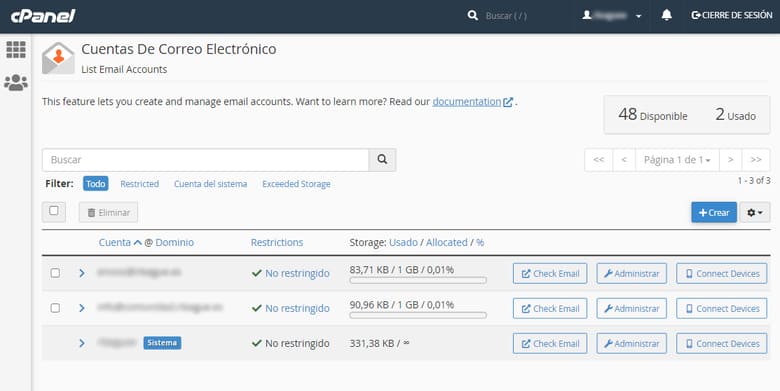 Una vez estes dentro de cPanel tienes que ir a la sección de «Correo electrónico» y hacer clic en la opción «Cuentas de correo electrónico». Verás el listado de las cuentas de correo que ya tienes creadas, para las cuales podrás realizar las siguientes acciones: