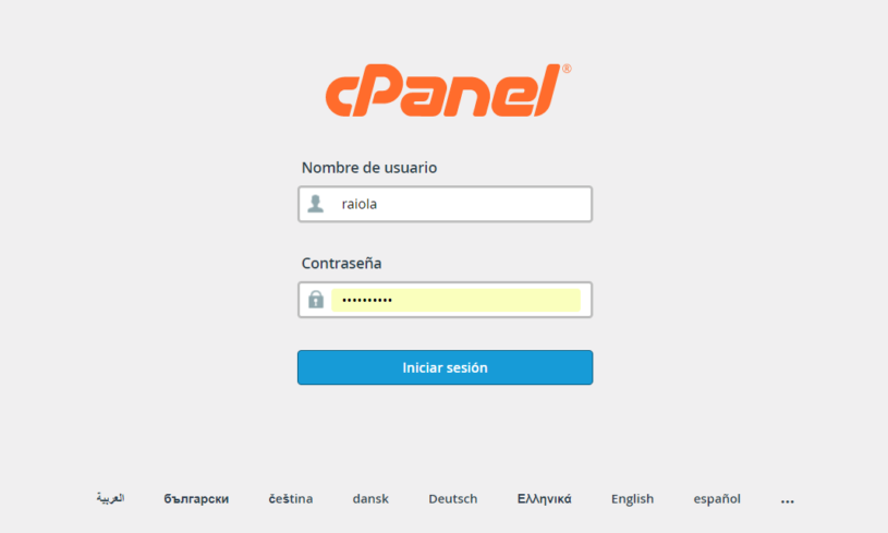 - Accede a cPanel. Puedes hacerlo desde «tudominio/cpanel» o desde tu área de cliente de Raiola introduciendo tus datos de acceso.